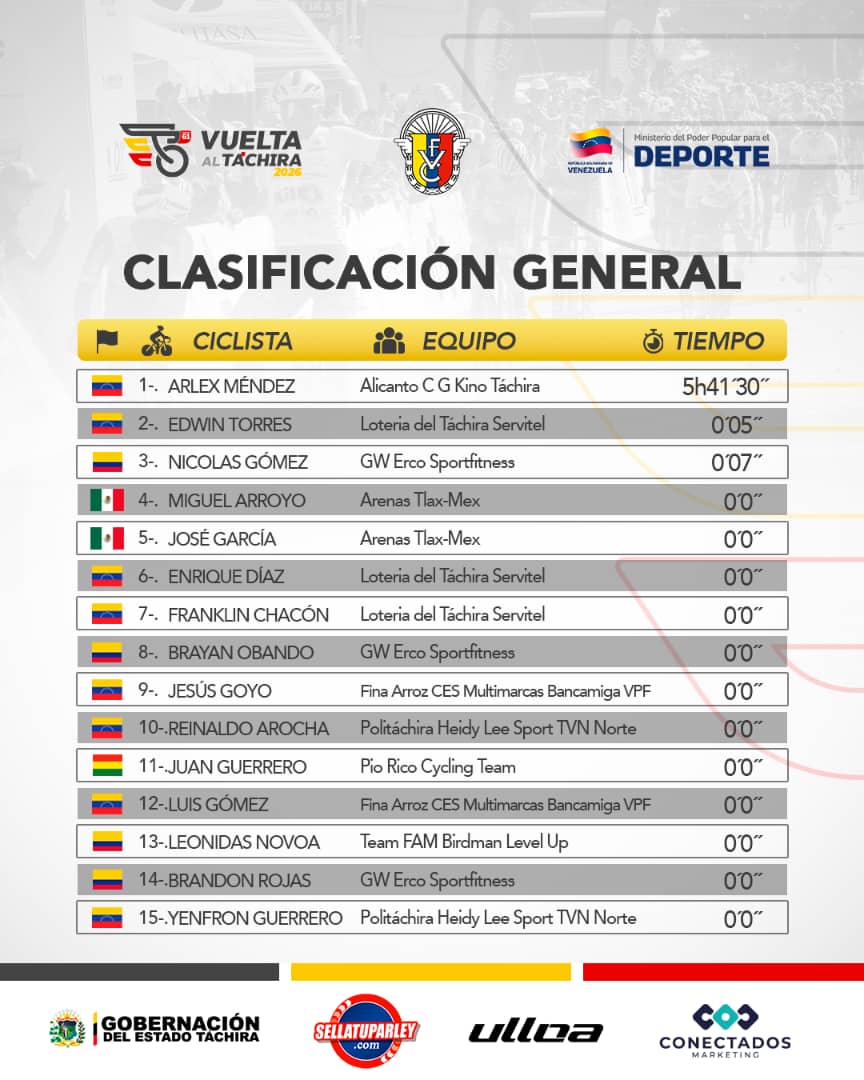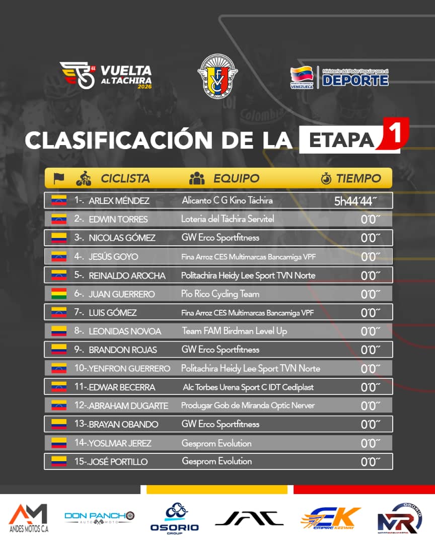 Extensa y extenuante fue el cumplimiento de la primera página donde se escribe la rica historia de la edición 61 de la vuelta al Táchira en bicicleta que dejó como ganador, luego de 5 horas 41 minutos y 41 segundos, al pedalista Arlex Méndez, corredor al servicio del Alicanto Consulting Group/Kino Táchira.