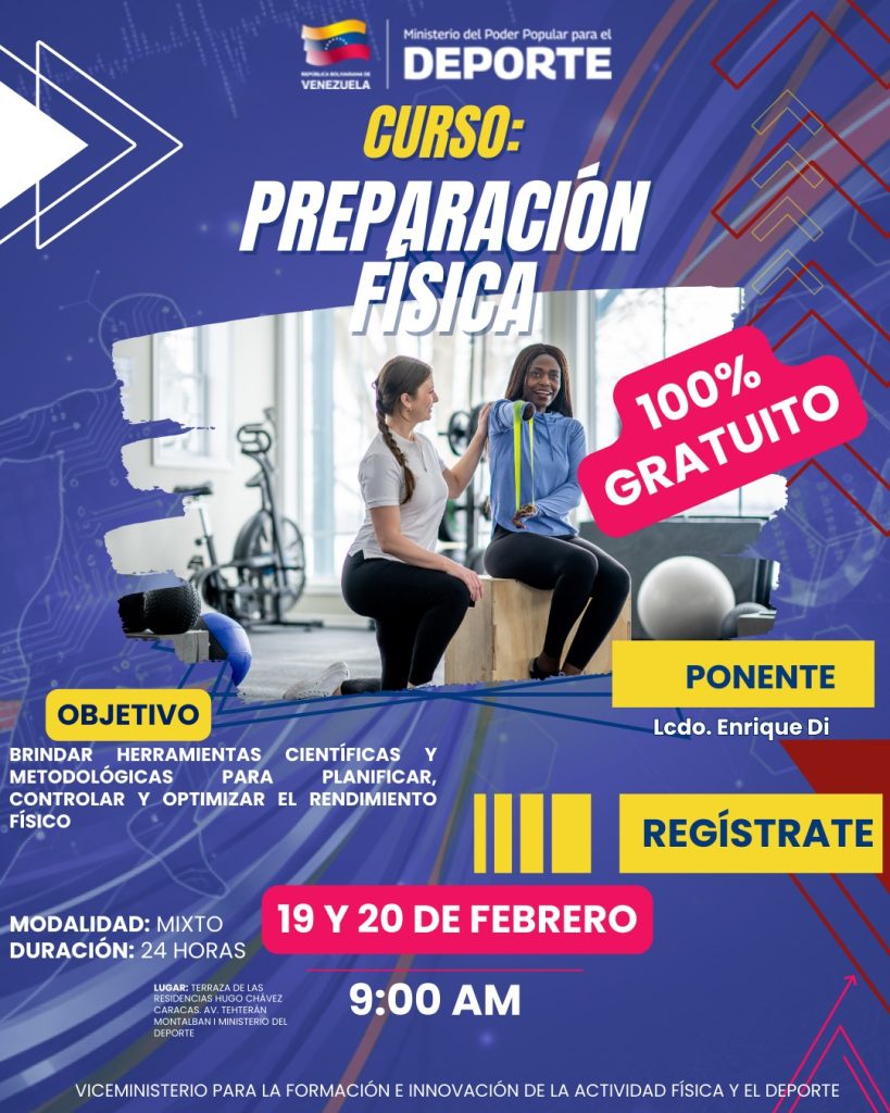 El ministerio del deporte a través del viceministerio de formación e innovación de la actividad física y deporte implementará el «I Curso de Preparación Física», que se llevará a cabo del 19 y 20 de febrero, dirigido a entrenadores e instructores que buscan combinar la teoría científica con su aplicación práctica en el alto rendimiento y la salud.
